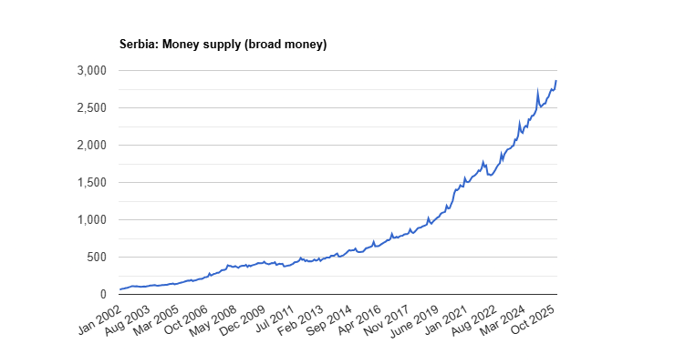 Količina srpskih dinara u cirkulaciji od 2002. godine. Izvor.